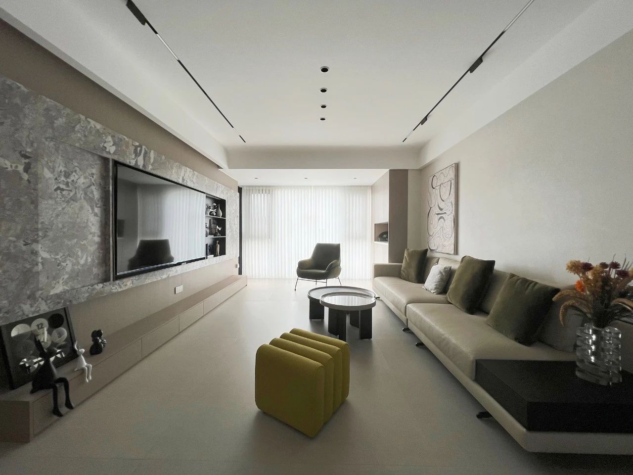 客厅无主灯设计以及在原木、奢石的包裹下营造慵懒放松的休闲空间。客厅延伸至阳台,让客厅视觉更加开敞,充沛的自然光通过梦幻帘过滤投进室内柔和有层次感,带来舒适宁静的居家氛围。