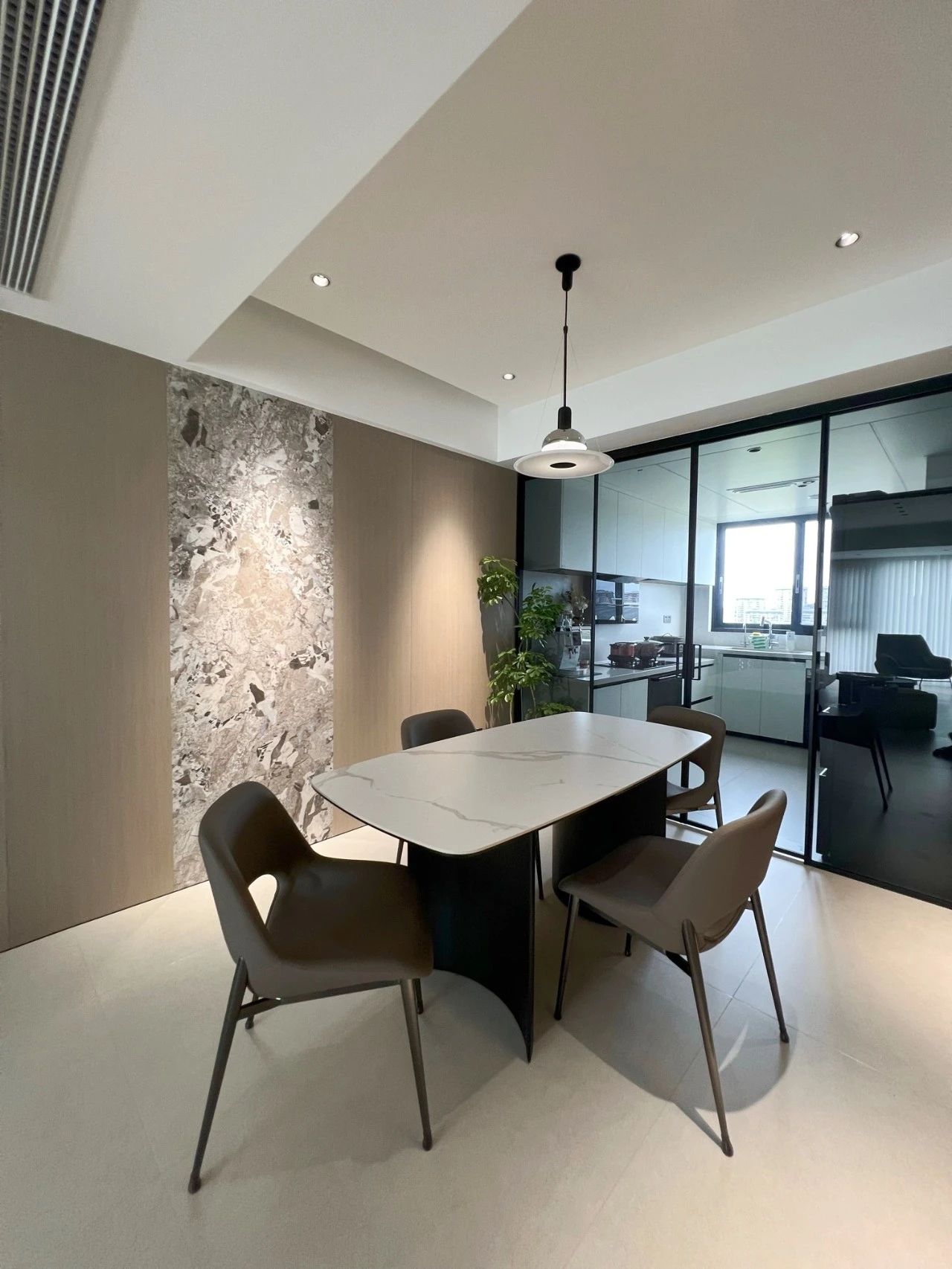 设计,便是把不同的材质属性在以相同的设计语言巧妙融合。结合素色瓷砖、岩板、烤漆板、不锈钢、木饰面、艺术漆、艺术玻璃多种材质搭配,更显简单利落的清爽气质。