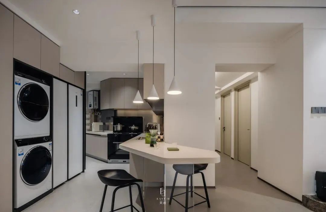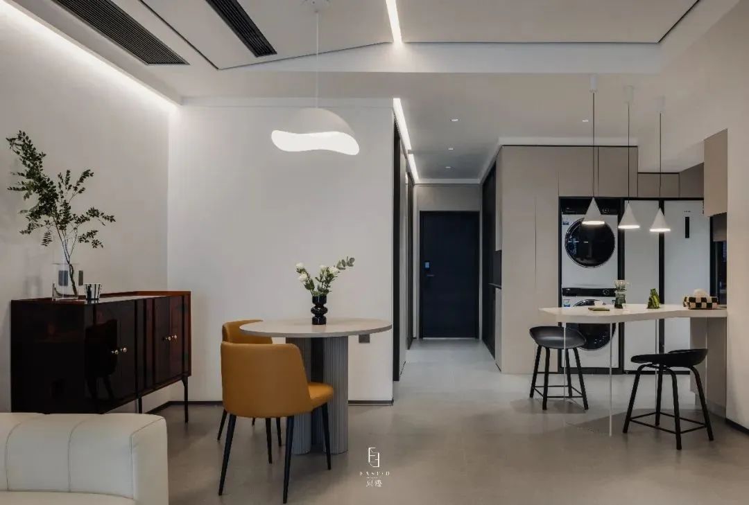 在厨房方向延伸出来的岛台,增添整个空间当中的设计感,同时也可以很好利用空间当中的布局,让空间更有实用性。