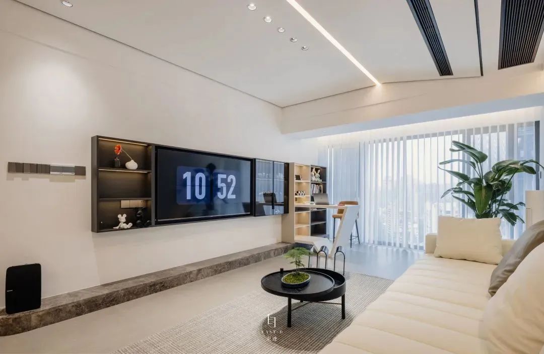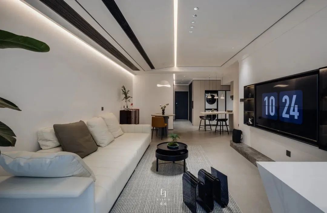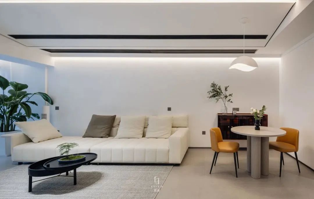 繁巷生活满,不及家中暖。设计不仅关乎美学,它还会影响我们在家时的感受。本案给人以温馨舒适的感觉,在“瑜伽”系列宁静、平和、舒适的大背景下,融入不同的质感和色彩,引入浓郁的生活气息,完成理想的居所。进入客厅,映入眼帘的是饱和度比较低的素色构成的生活空间。将白色的干净纯粹与大面积“瑜伽”系列的恬淡素净进行巧妙的利用,一个舒适简约的居住环境便呈现出来。客厅与餐厅区域、吧台等形成比较开放的布局,让整个空间变得简单通透,大面积落地窗满足空间当中的采光,让空间变得更加舒适。阳光透过窗户洒下的光阴,有柴米油盐的琐碎,也有诗和远方的幸福。