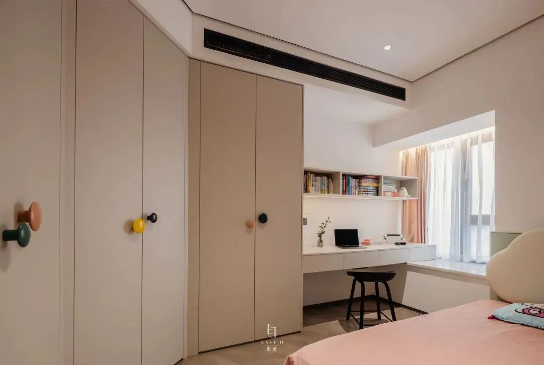 卧室的细节体现了现代风格的自然协调与轻松舒适。主卧主要是深与浅的呼应,令人感到优雅宁静的氛围气息;女儿房延续了简约的设计,但是又透露出整个空间当中的童真性,色调的统一,让整个空间变得更加梦幻。用最少的设计语言,给人无限的放松。灰色调精致内敛,看起来好像可以装得下各种情绪,有了细节与光线的衬托,整个空间变得更加干净、纯粹、无负担。本案最突出的设计亮点,是十分讲究空间的收纳与利用,灵活运用每一寸空间,引入浓郁的生活气息,满足不同的生活需求。