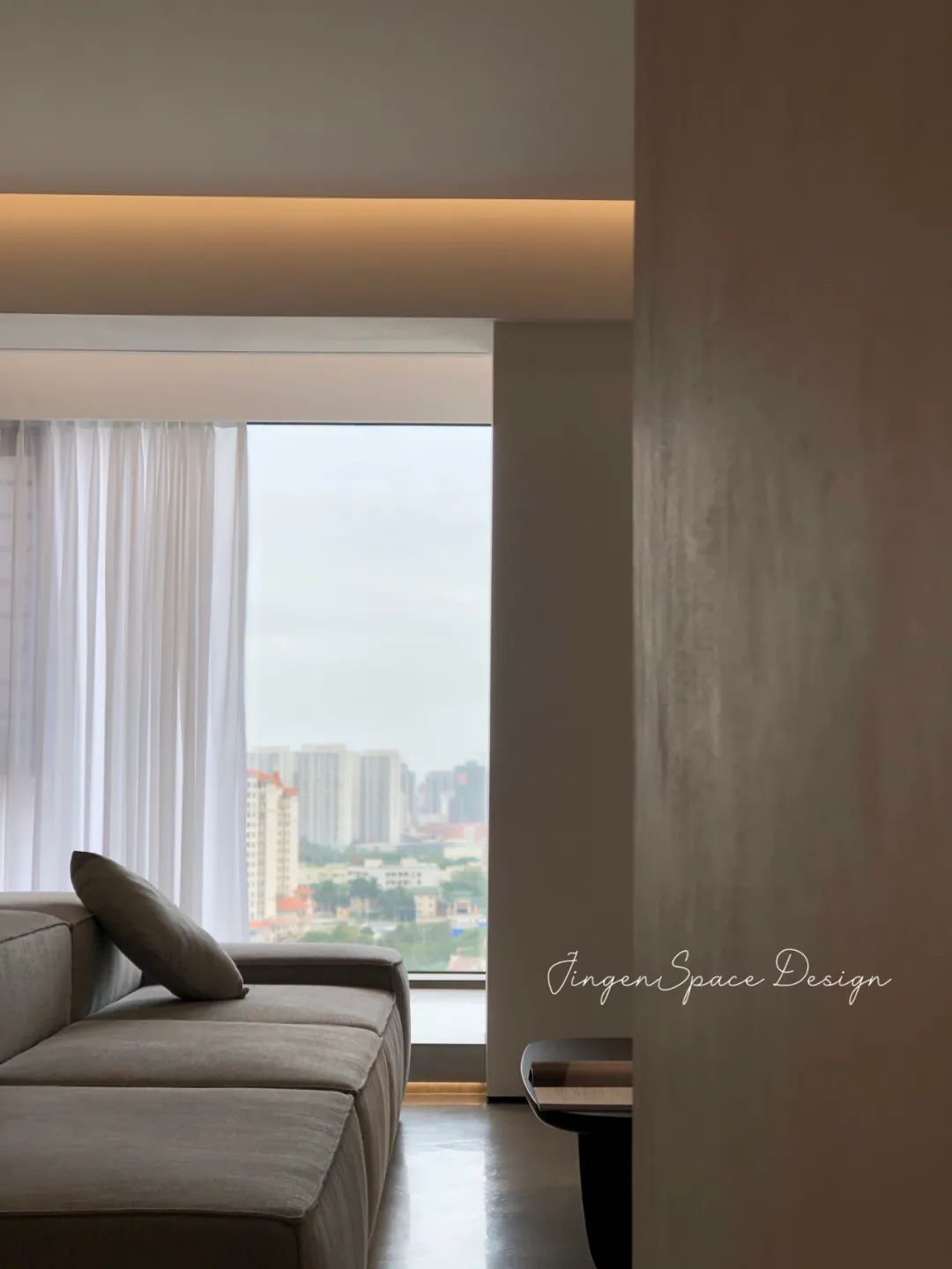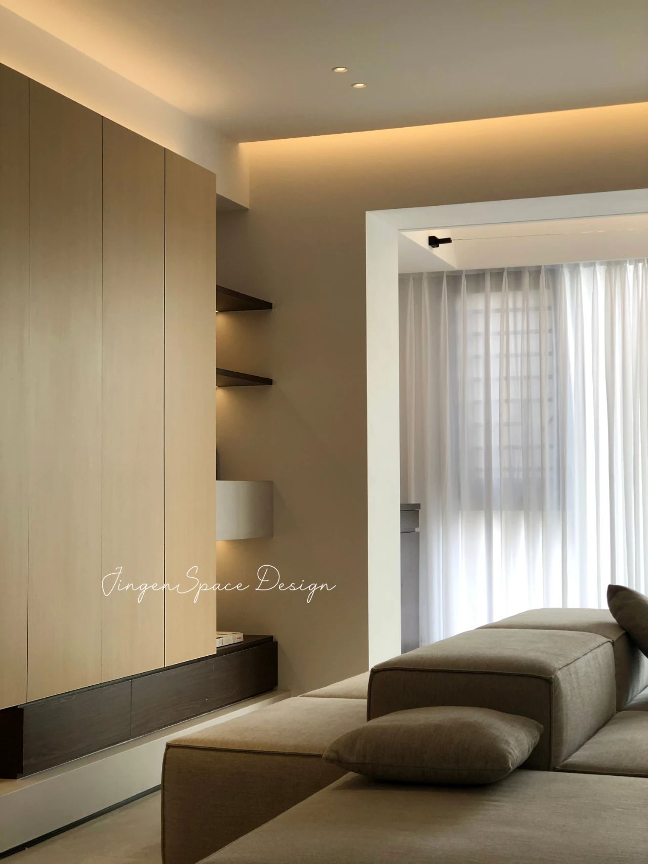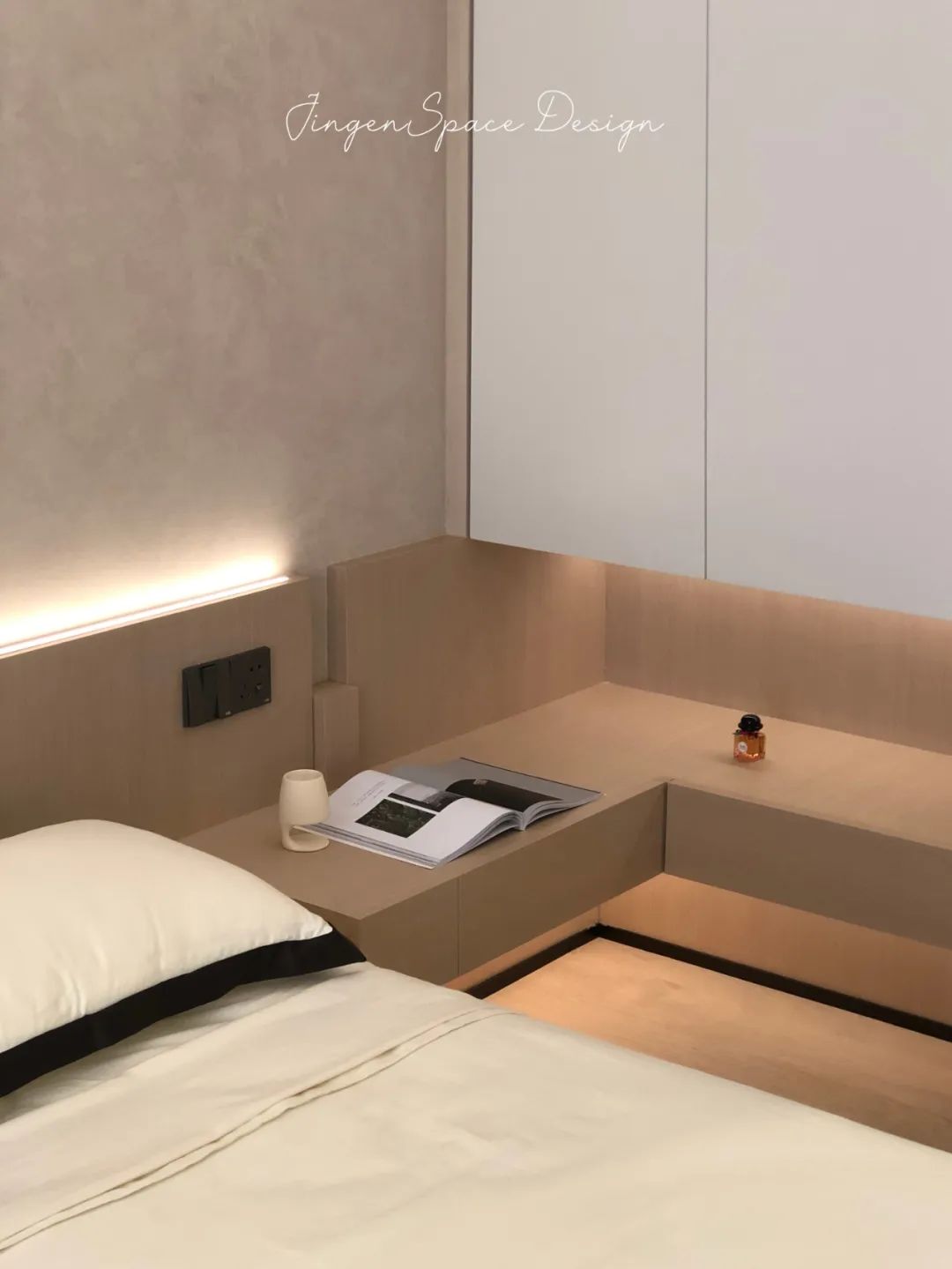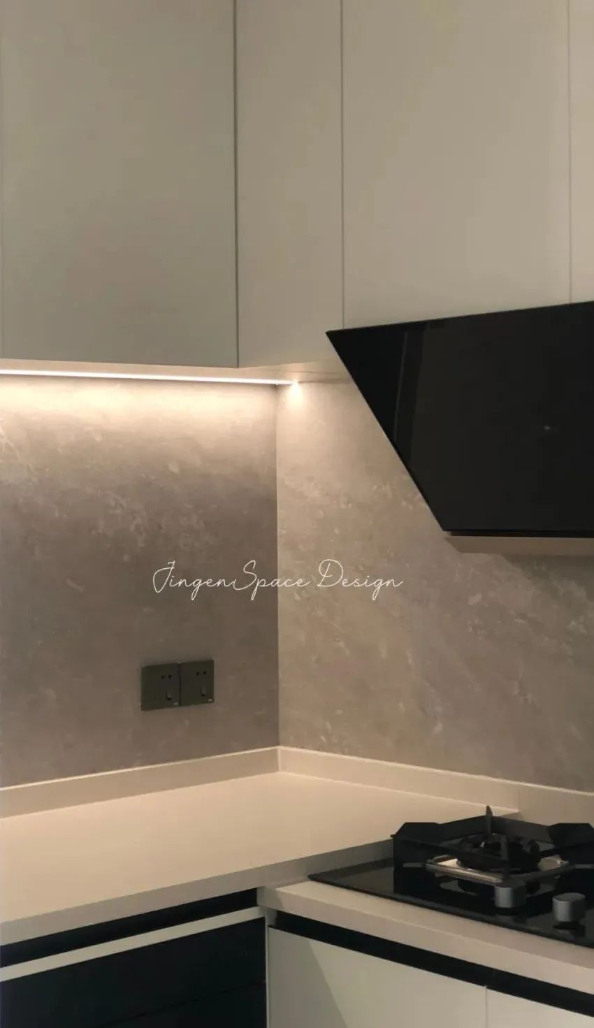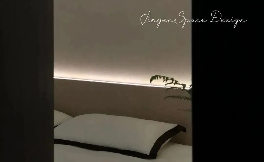 空间中不同的材质在明度不一的低饱和素色搭配下相互呼应,丰富了空间层次,加上当中的细节,营造了精致高级的空间氛围。