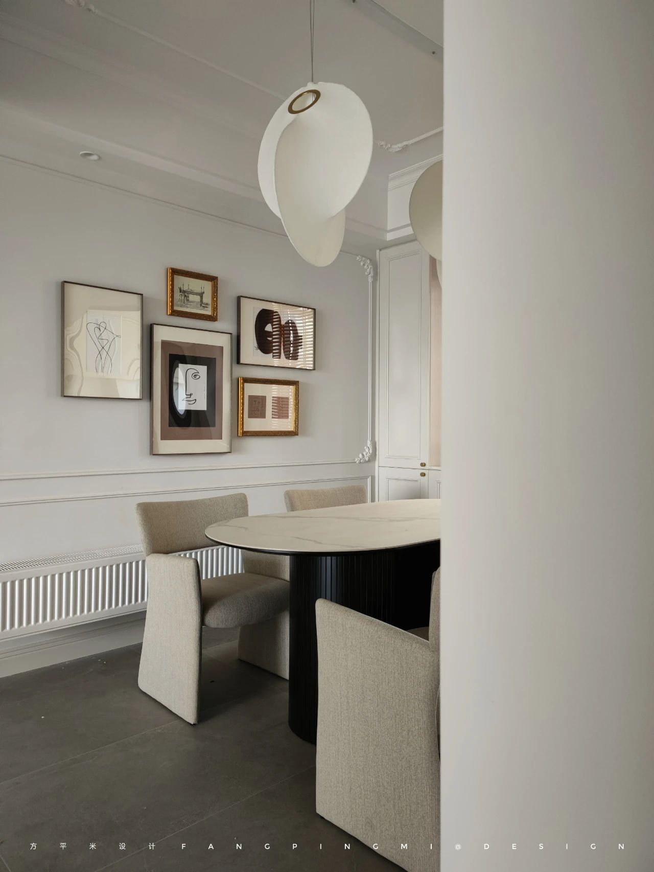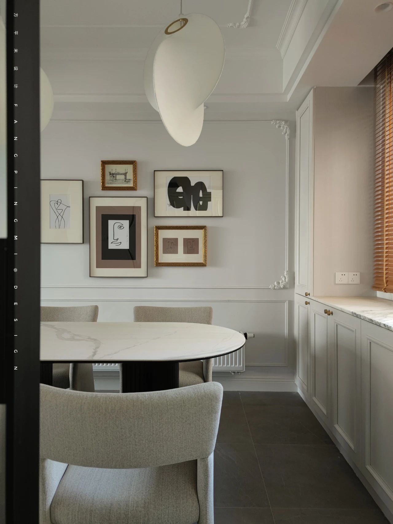 温润素白与内敛灰调作为空间氛围的起点,精致的雕花造型石膏线在现代居所里注入法式浪漫,再在空间中发挥不同材质本身的美,表达出整体的丰富质感和触感的微妙结合。