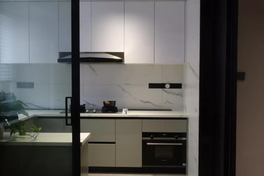 墙面“卡拉拉”系列与白色柜体将周围环境融为一体,简约线条清爽干净,减轻体量感与视觉压力。