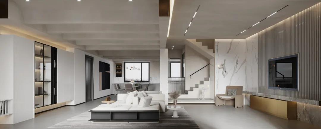 楼梯同样应用的是“量子灰”系列,素色人文暖灰定调现代家居背景,将时间打磨出来材质色彩真实还原,清新中显温暖。