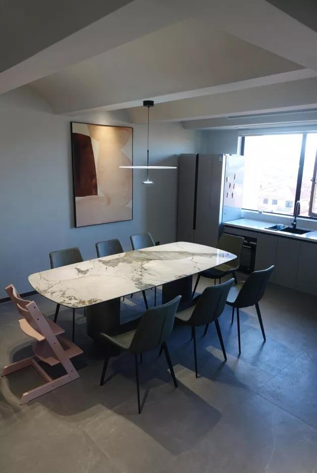 在客餐厅的设计上,设计师突出“社交空间”的理念,尽量打破空间之间的隔断,使整个空间可以成为家人、好友零间隙的交流和畅谈的场所。同时,关注空间的灵活性及延伸感,每个区域之间的关系不是孤立的,而是相互相融的。