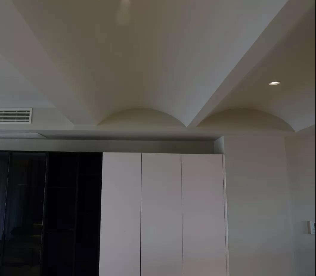 餐厅的顶面原先便存在非常多的梁,做平吊顶就会非常的低,为了弱化它,做了几个小拱形的吊顶。