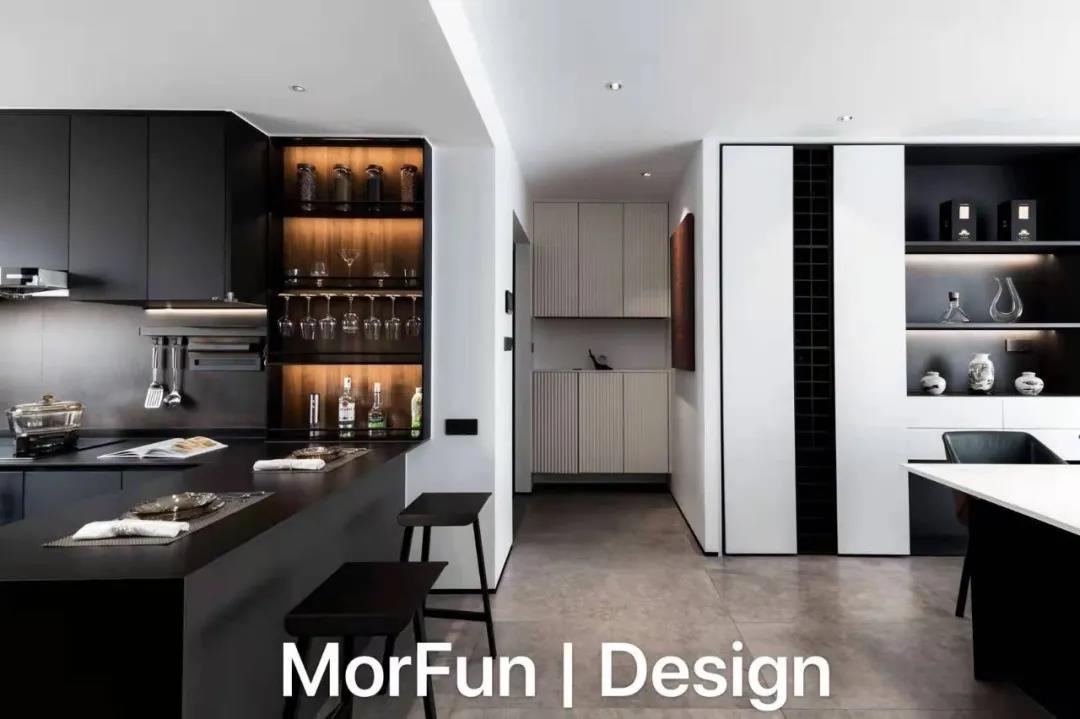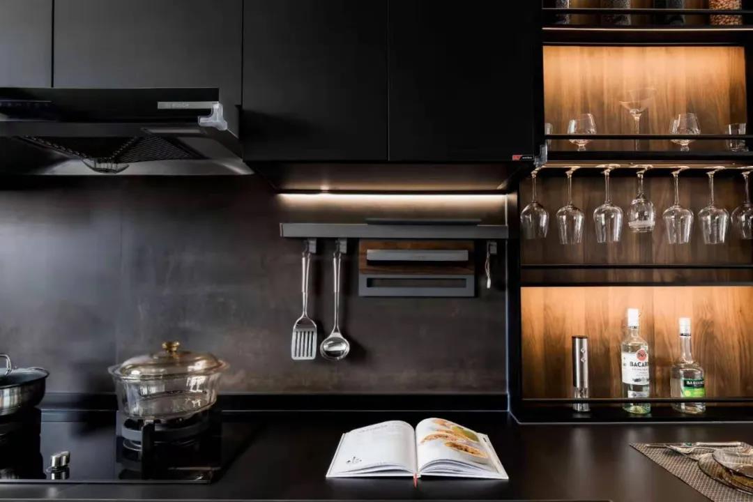 厨房延续整体主调性,将简约的手法与高级的色调融合,十分“有性格”——深色的柜体色调保持了整洁的统一性,营造出空间的深邃和高级感,彰显时尚个性。