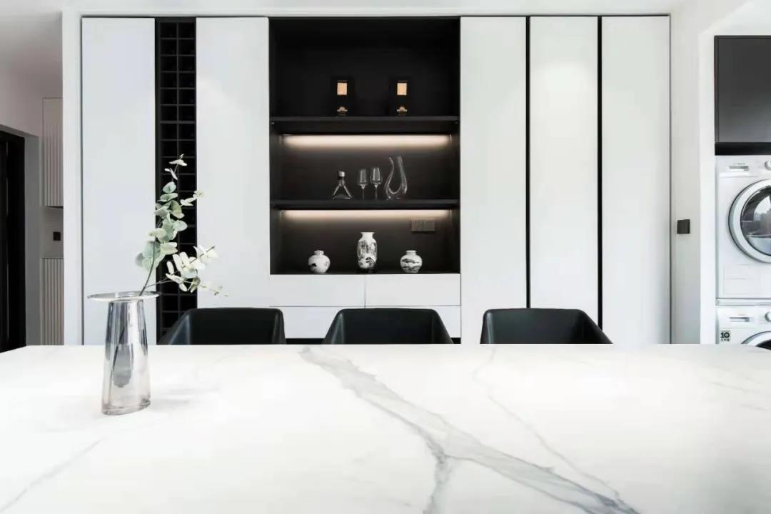 餐厅区域以纯净的白色为主,极简的黑白配,这样的餐区设计更显优雅和精致。