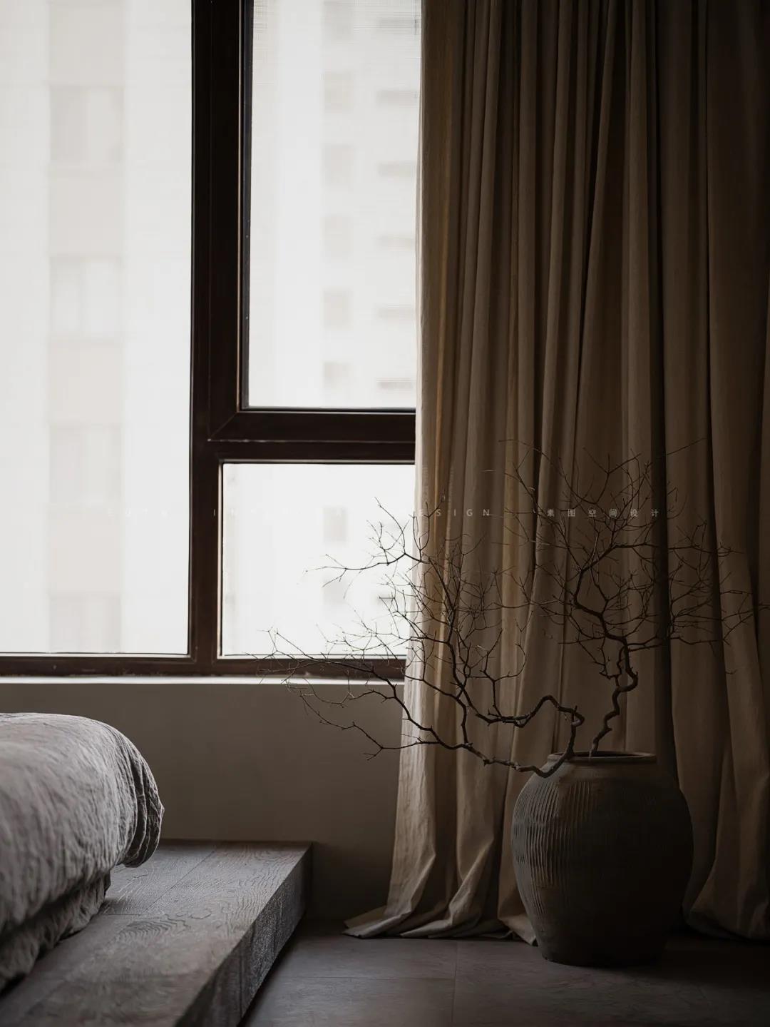 主卧搭建了地台,在形式上对空间进行划分,也可以起到一定防潮作用。空间中软装的搭配、窗帘的选择、色调的把控都很好的营造出了简洁朴素的空间氛围。