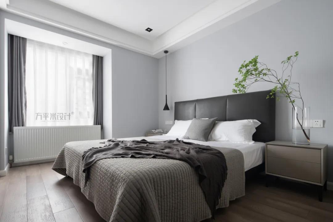 主卧室以白色、灰色、原木色为主调,延续了客餐厅的色系配比,让整个家的整体色彩融合度更高。
