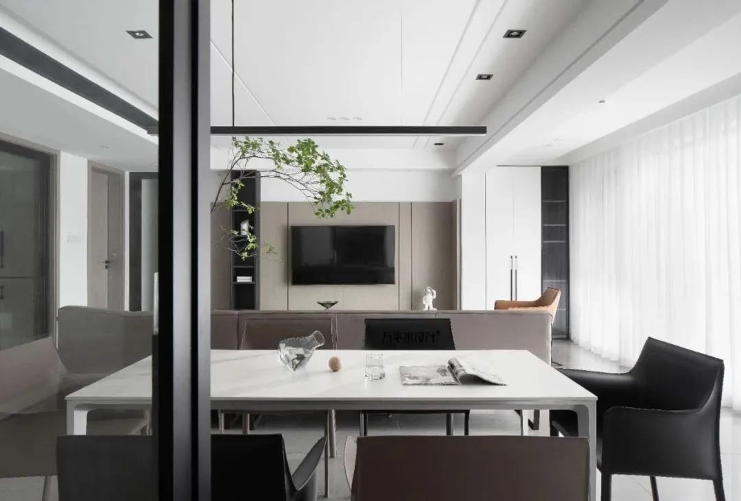 极简的线性吊灯软性界定客餐厅,空间主要以暗藏式筒灯保证基本照明,射灯营造家居氛围。