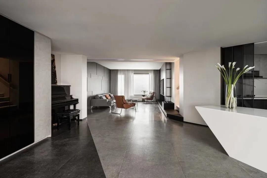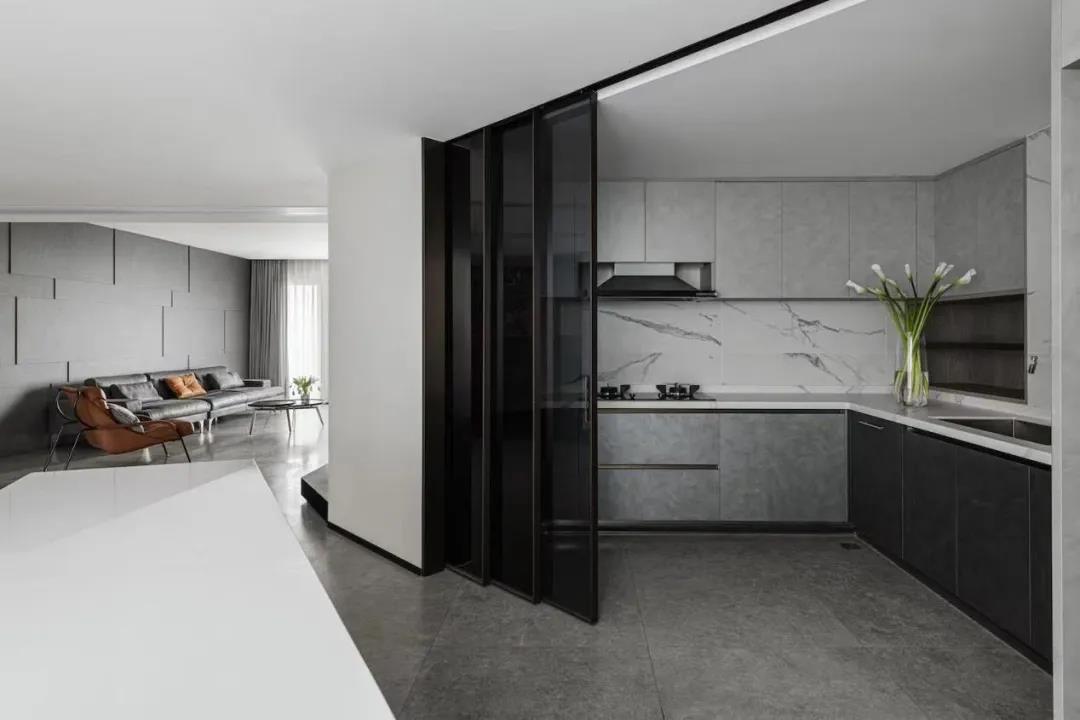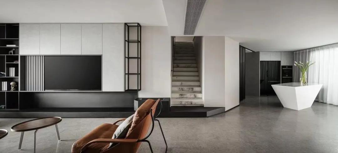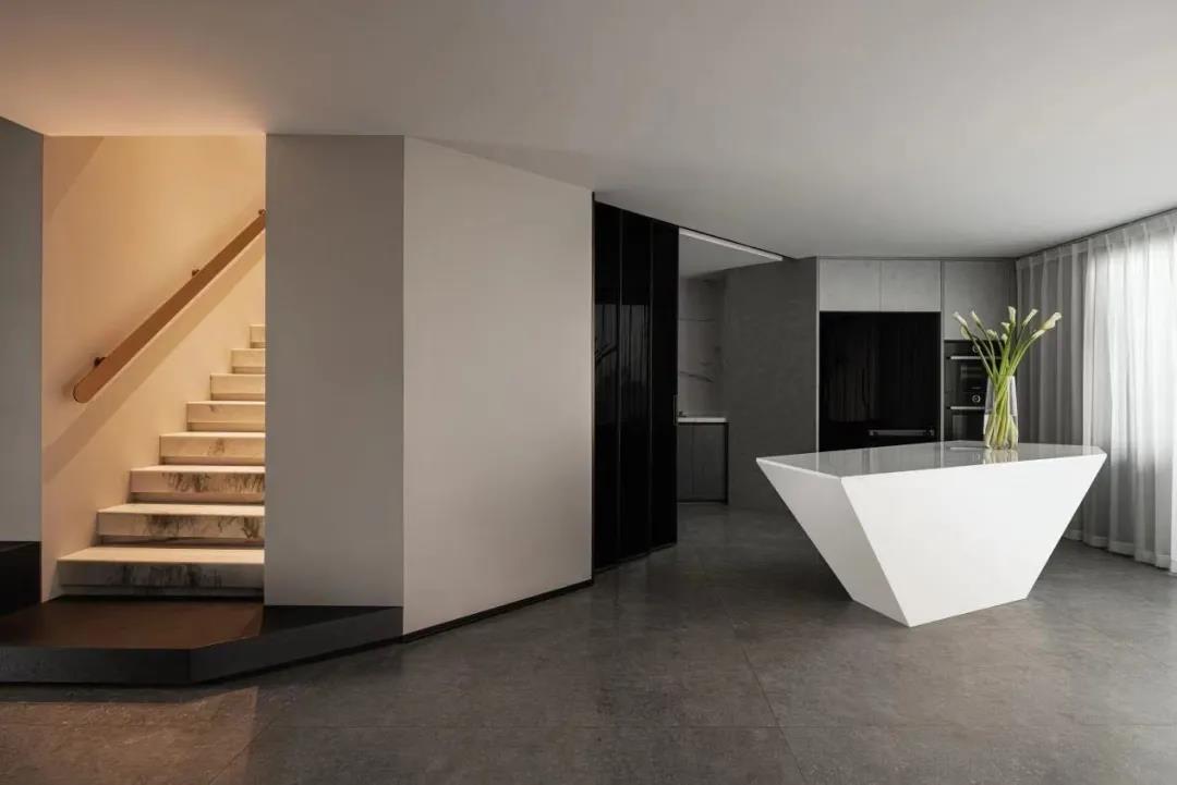设计师深知Luke长期在高空飞行,精神时常处于高压之下,于是使用低饱和度的色彩,可以有效缓解精神紧张。整个空间有着飞行器般的利落感,干净、简洁,黑白灰的色彩从容地过渡,犹如白天和黑夜的交替,多了一丝安静的美好。 还有很多呼应Luke职业特征的设计表达,例如厨房岛台犹如机翼的形态,地面黑白分界线就像黎明天际线的体现,低调内敛地呼应着Luke在飞行时的自由状态。 / 生活与温度 一层开阔通透,设计师把原始格局进行打破重组,减少公共空间的墙体阻隔,规整出一个具有整体性、通透感的空间。客厅、餐厨…布局动线中充满值得探索的小心思,相互互通,满足功能需求之外,简洁的素色主调,干净利落的线条感,整个空间给人以舒缓治愈的心理感受。