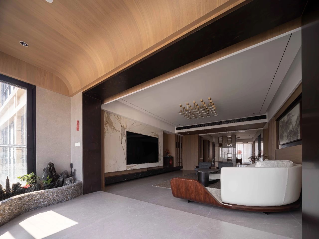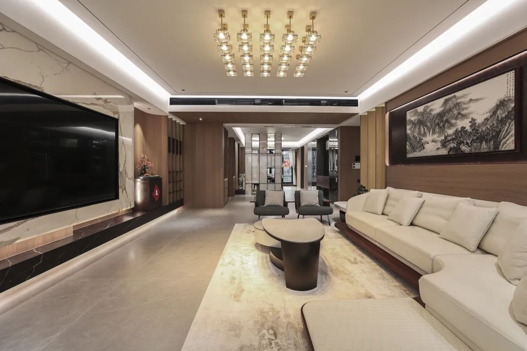 在公共区的范围划分了三大功能区,客厅兼有会客,茶室,观景阳台功能,中转展示区陈列屋主一系列珍藏品,以及整洁的餐厨区域。