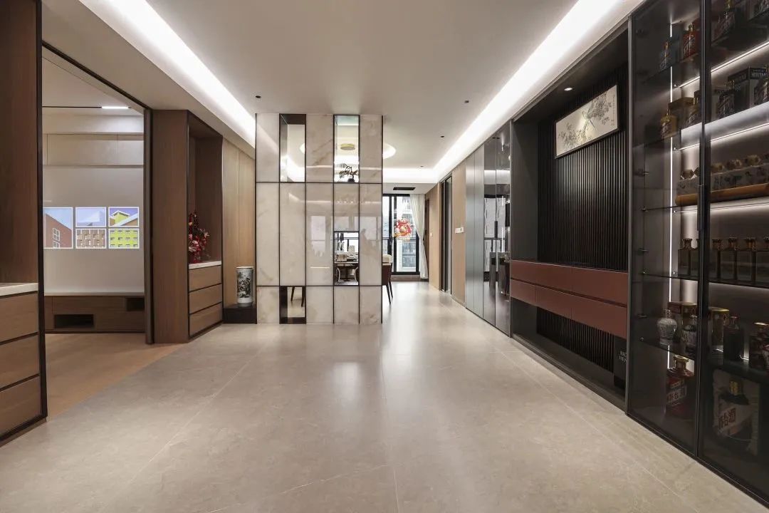 本案设计师主要从色调、灯光、选材进行考量,入户背景选用了天然石材鱼肚金与不锈钢、木饰面相结合,由于原先门厅光线较暗,为了拥有更好的空间感和采光,增加了带有灯光的氛围设计,使得整体明亮又大气。
