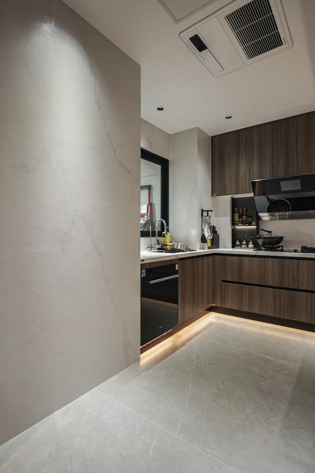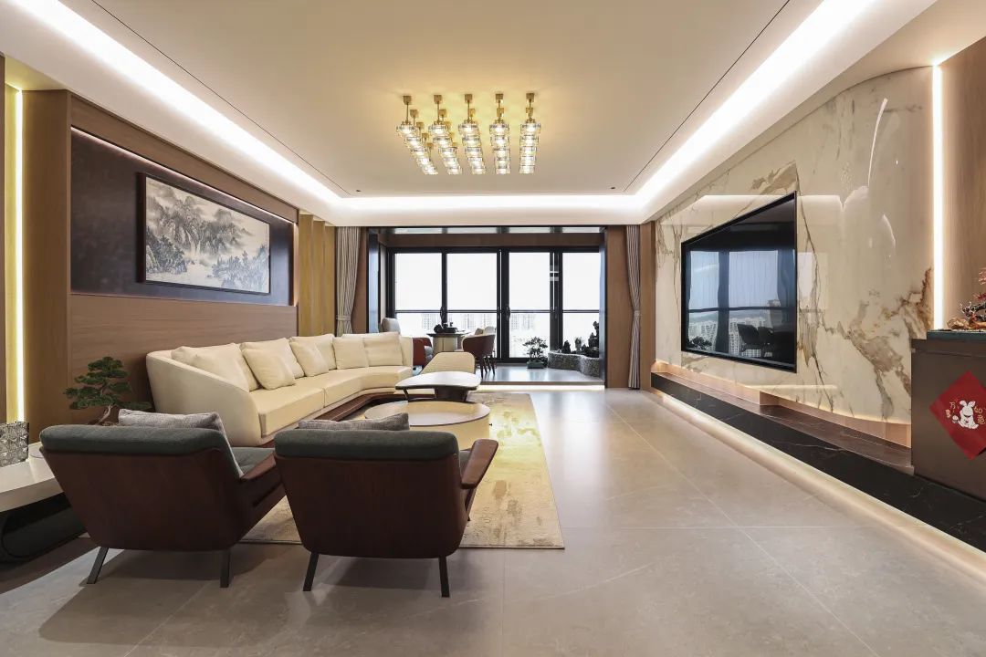 客餐厅通铺1200*2400mm的欧文莱灰岩板,自带暗纹,材质柔和,质感出色,结合整套家具、木饰面与石材相融合,公卫选用的墙地砖更显稳重、舒适的空间效果。