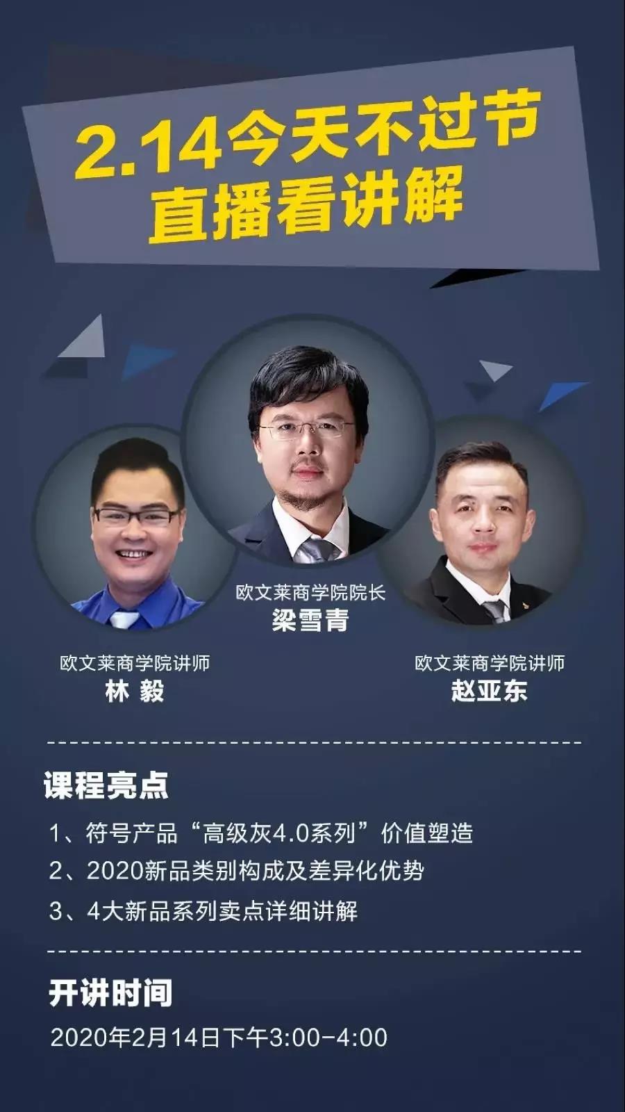 NO4:开办“直播讲堂” 开年以来,总部连续开办四期“欧文莱直播讲堂”培训,目的就是指导经销商熟悉、了解新零售特点及打法。