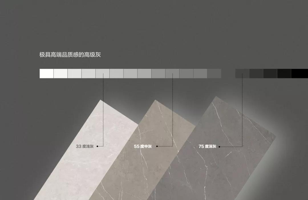 现代风盛行可以说是2017年陶瓷行业最受关注的集体动向,有近乎80%的一线品牌参与到这股风潮当中,从年轻化消费市场的倒逼,到行业集力行动引爆,以黑白灰为色彩主流的现代简约风已然成为品牌贴近时尚潮流的标志。  2017年,在欧文莱开启的“灰调时代”中,“欧文莱灰”系列绝对是不可或缺的关键词。   众所周知,高级灰的把控在行业产品研发上是一道难题。欧文莱采用独创的“CS柔色技术”,突破传统对灰度的主观操控,注重将人对瓷砖细微的主观感受转化成技术参数进行产品研发,以科技手段保证瓷砖表面灰度深浅冷暖表现的纯正性。产品系列中的33度灰、55度灰、75度灰已经成为瓷砖高级灰里浅、中、深灰度的重要参照。