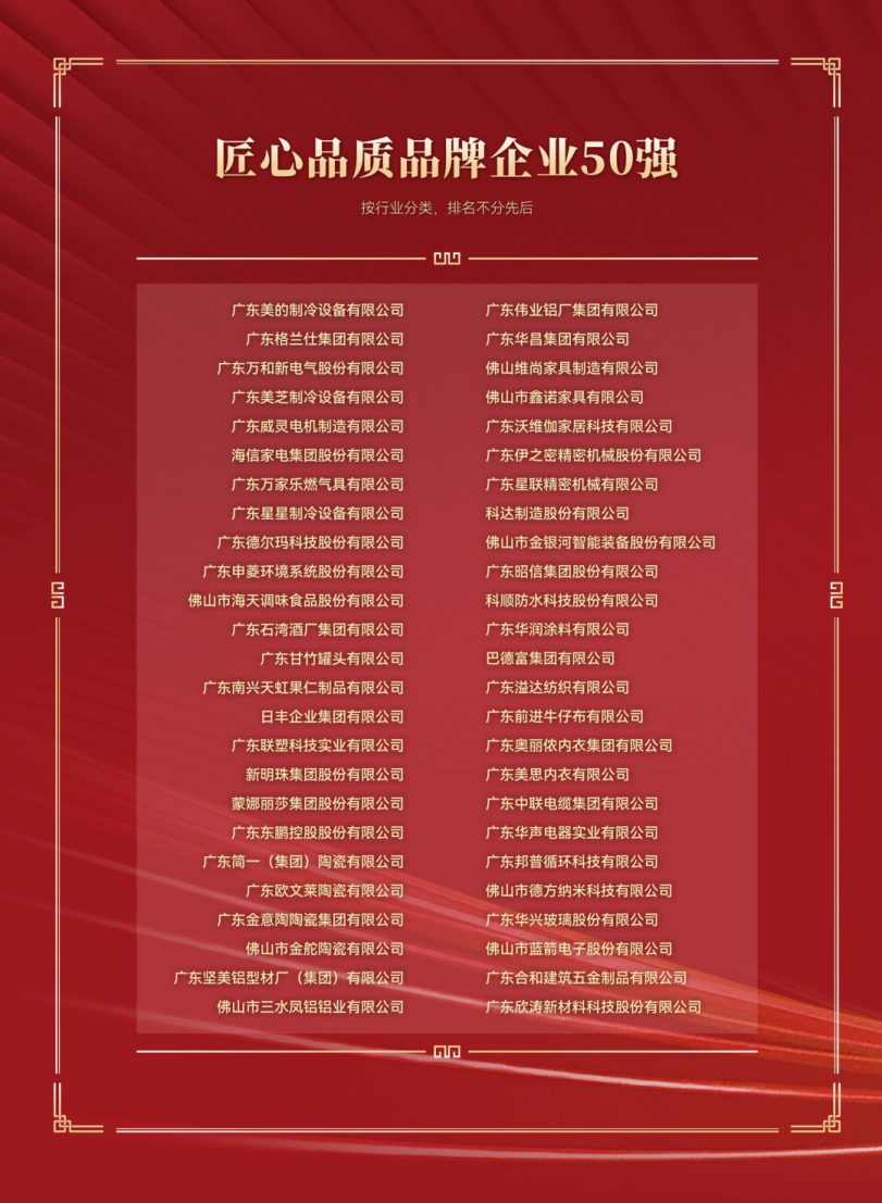 △ “佛山市匠心品质品牌企业50强”榜单紧紧围绕与百姓消费息息相关的自主品牌产品,重点考察企业崇尚工匠精神,追求“以质取胜”,坚持将产品质量做到极致的典型做法,从市场占有率、品牌形象、质量水平、科技创新等多个维度进行综合评价。