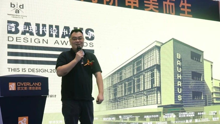 ▽ 欧文莱加盟商中心中区负责人林毅介绍欧文莱品牌渠道新动态,邀请设计菁英了解、参与BDA包豪斯现代设计奖评选活动